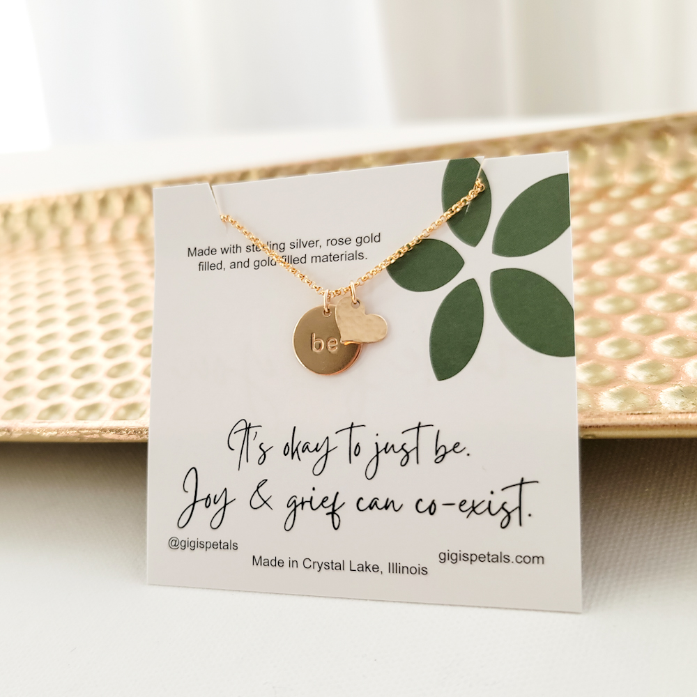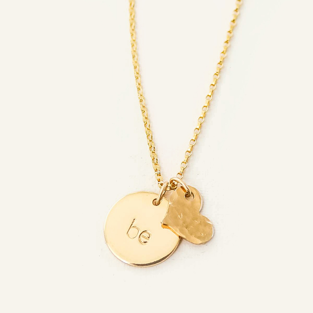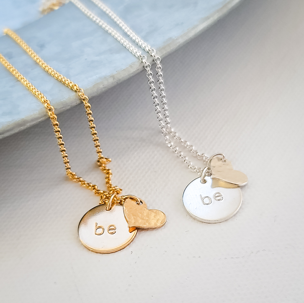 Designed to uplift and inspire, we hope that this necklace is a little reminder to love yourself and see the beautiful journey ahead in your life. This necklace can be made in rose gold filled, gold filled, or sterling silver. The necklace is made with a thick 13mm disc and hammered 8x10mm heart.