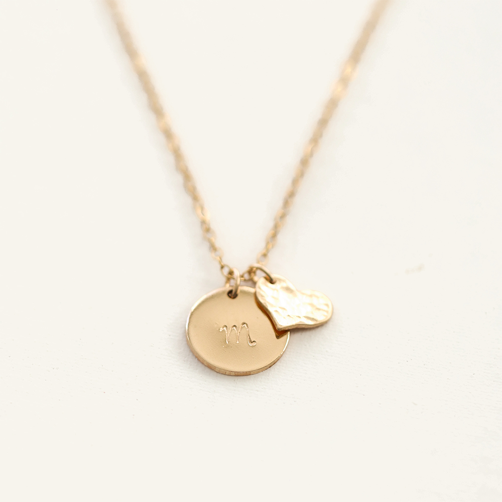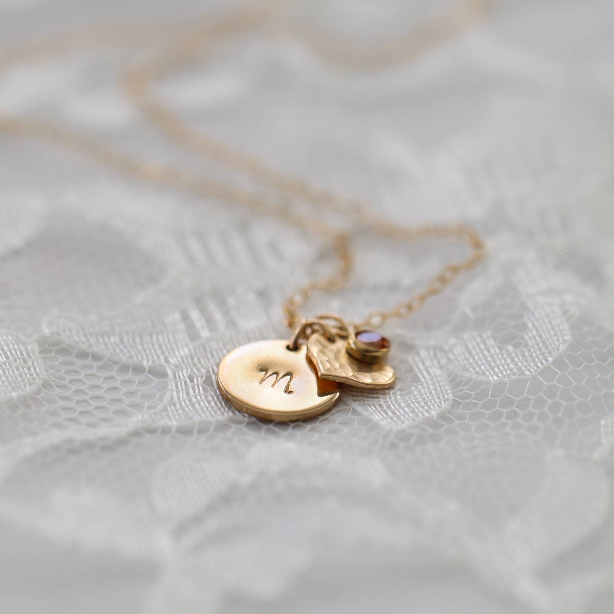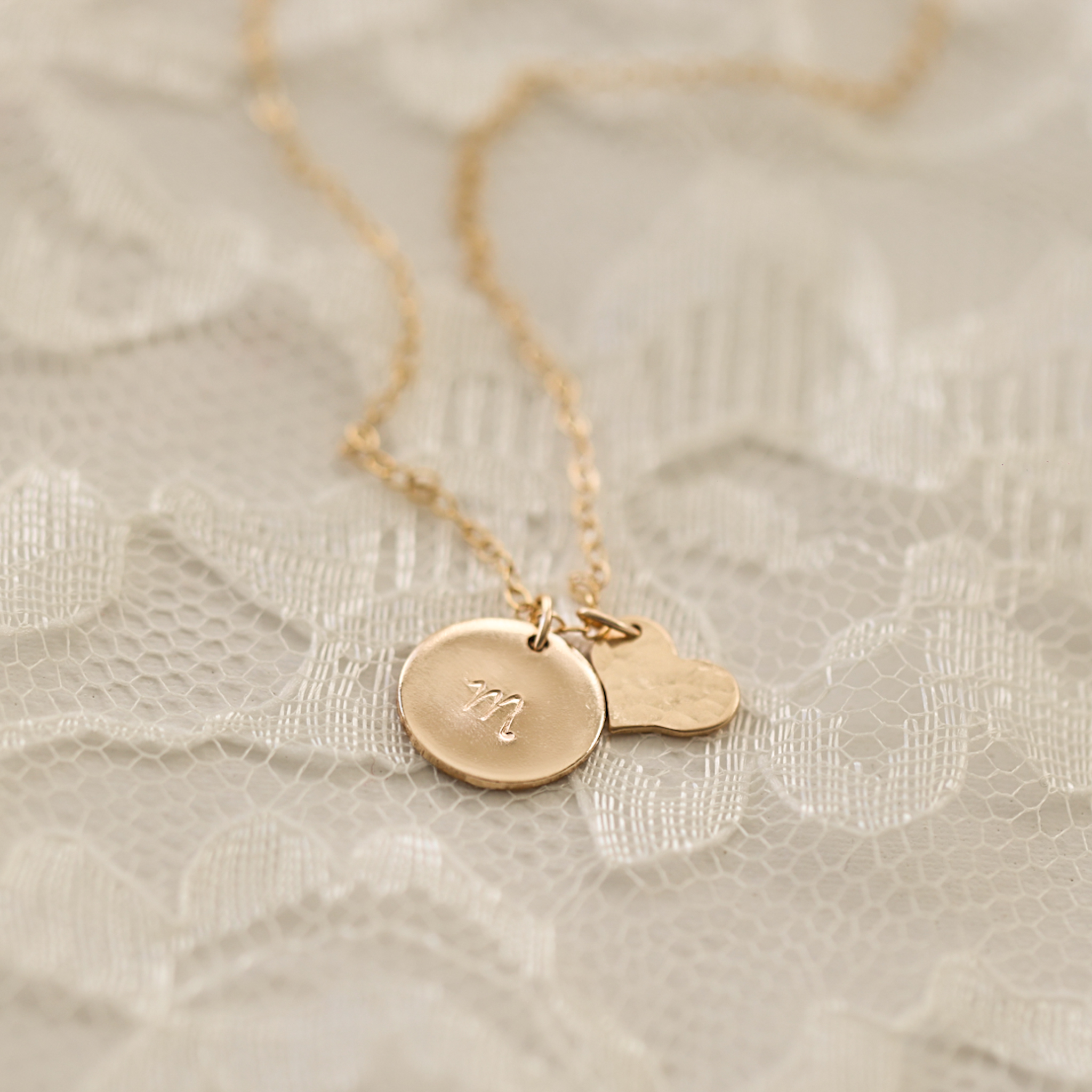 This necklace is made with a hammered 8x10mm heart and a 13mm disc (you choose the initial or heart you want stamped on the circle disc) in rose gold filled, gold filled, and sterling silver materials so that it can be treasured for years to come.