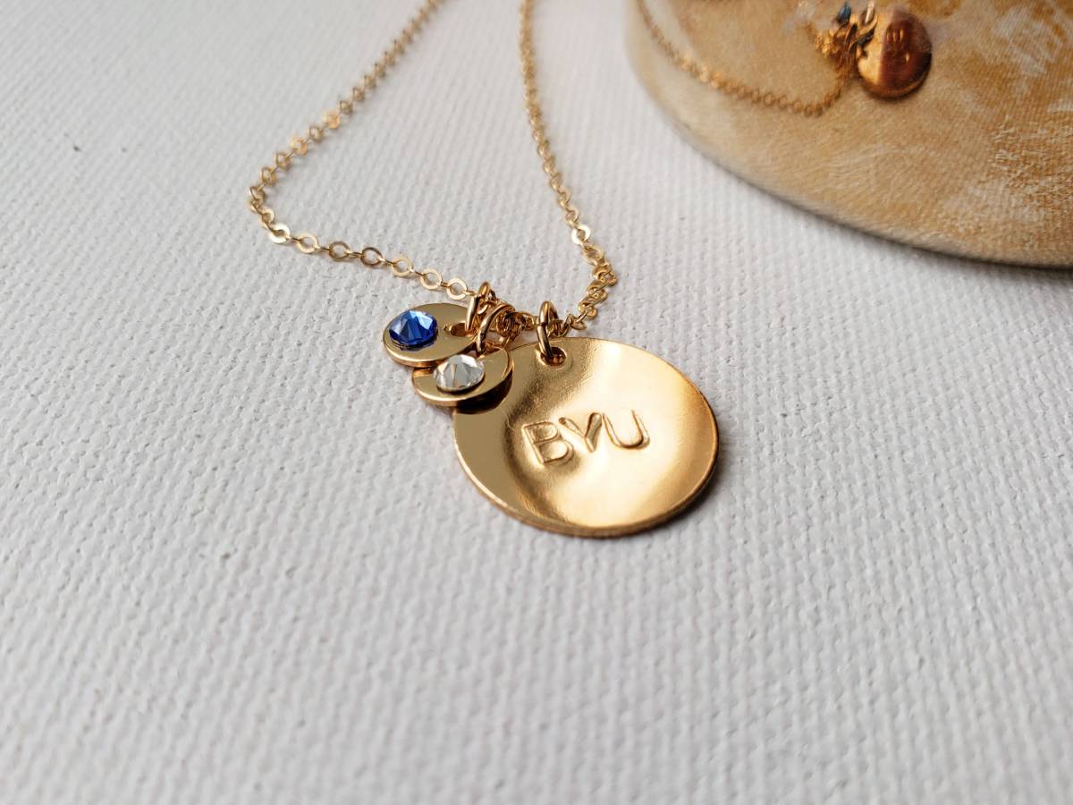 The college disc necklace celebrates your favorite school. Leave 2-4 initials you want stamped on it for your school name (i.e. BYU, SHS, MU, etc.), as well as leaving two Swarvoski Crystal colors (see chart) you want included. The necklace is made with a 19mm disc in gold filled, rose gold filled, or sterling silver, as well as two 6mm discs with Swarovski Crystals.