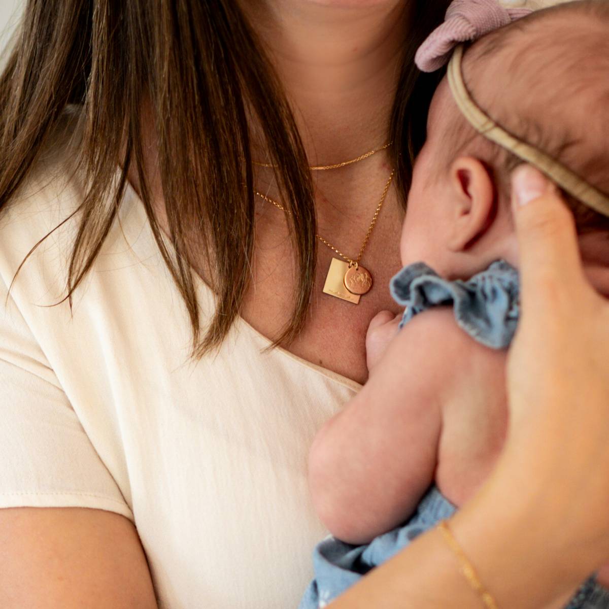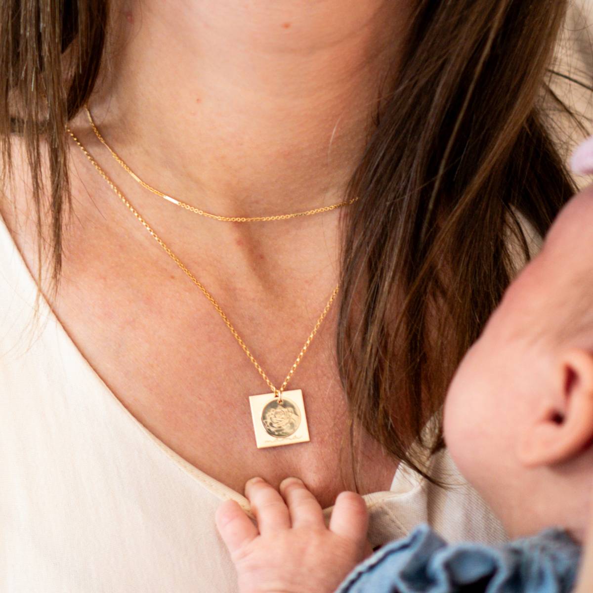 Our square mama necklace is super popular at local markets and fairs. This necklace is made with a thick 16mm square stamped with a cursive mama at the bottom with a 13mm hanging disc stamped with your choice: an initial, a custom stamp or a birth month flower on our rolo chain . Made with all gold filled, rose gold filled and sterling silver materials, this necklace will last for years to come.