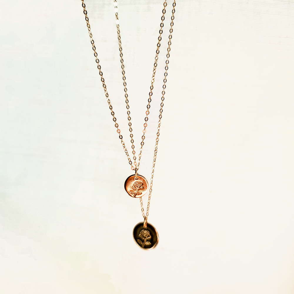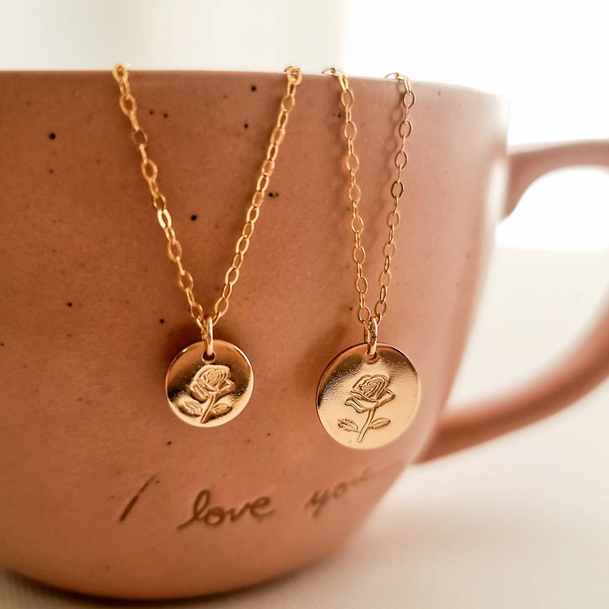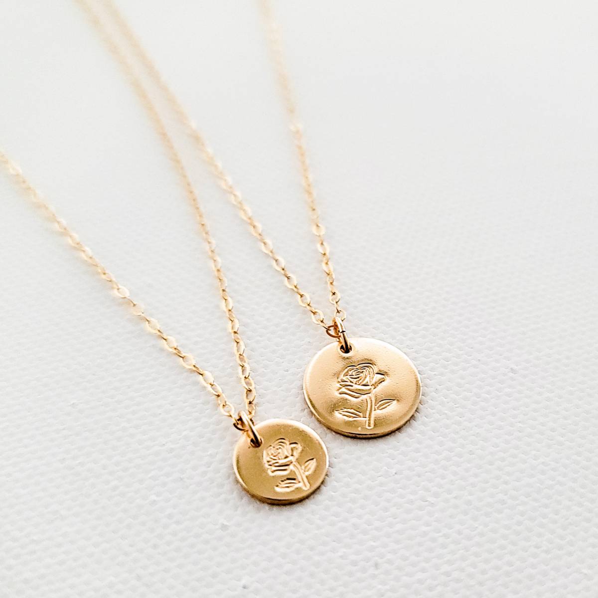 The discs come stamped with your choice of matching discs – rose, mama hen/baby chick, hammered, mama bear/baby bear, paw print, and initials. The rose, mama hen/baby chick and hammered disc sets are 13mm and 9mm in size. The mama bear/baby bear, stars, initials hammered discs and paw print sets are 9mm and 6mm discs. You can choose the disc sizes for the initial set. Please note the size differences in the picture. They come in rose gold filled, gold filled and sterling silver.