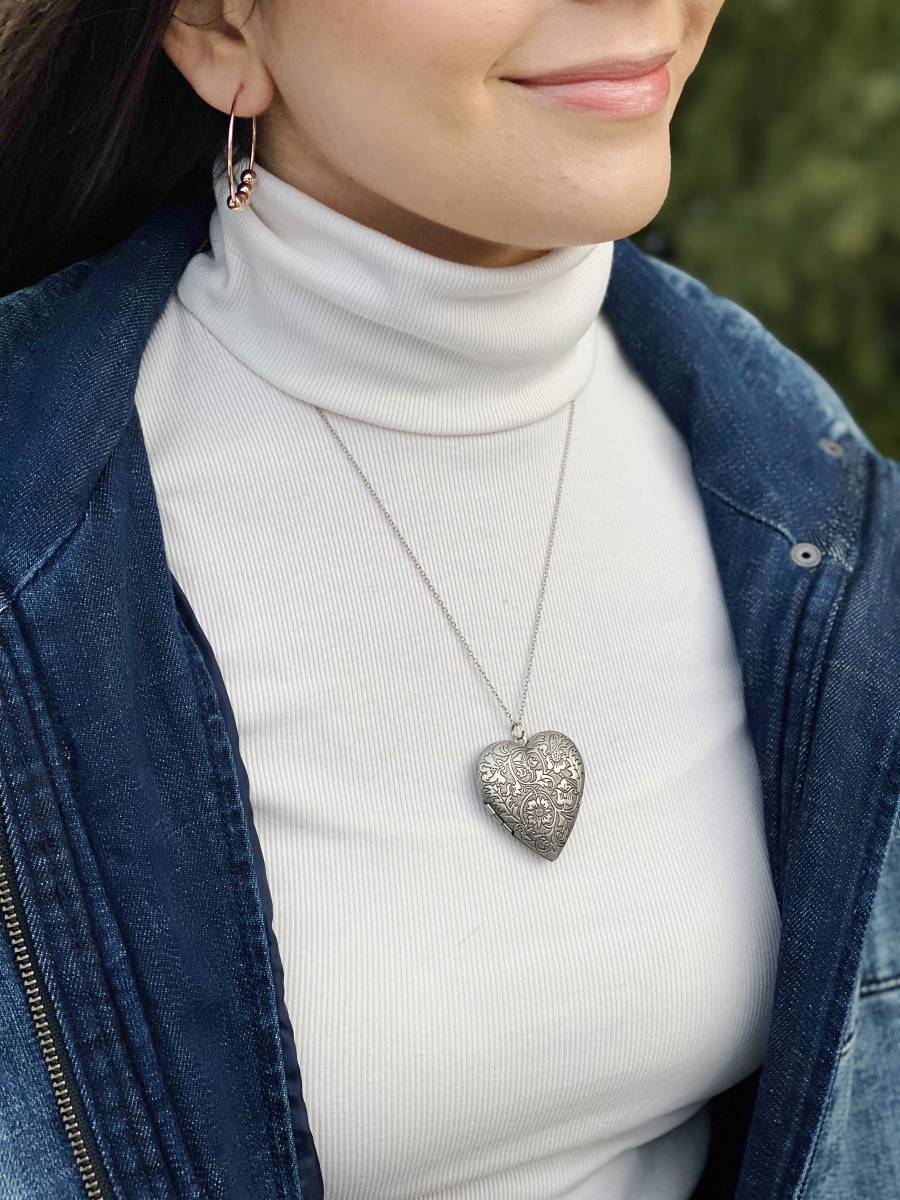 Antique Silver Heart Locket. This locket is a larger locket and super fun to add to just about any outfit – from young to old. You can choose an antique silver or sterling silver chain for the locket.