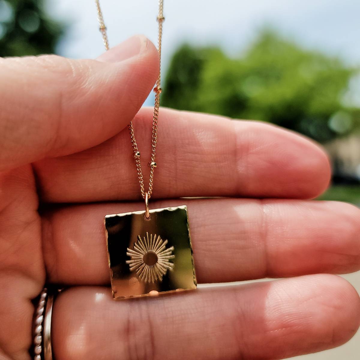 Our newest sunburst necklace is here to bring you a little joy! Stamped on a thick 16mm ( a little over 1/2 inch) square or disc in gold filled, rose gold filled or sterling silver on our popular gold filled, rose gold filled or sterling silver satellite chain, this is sure to become one of your favorites.